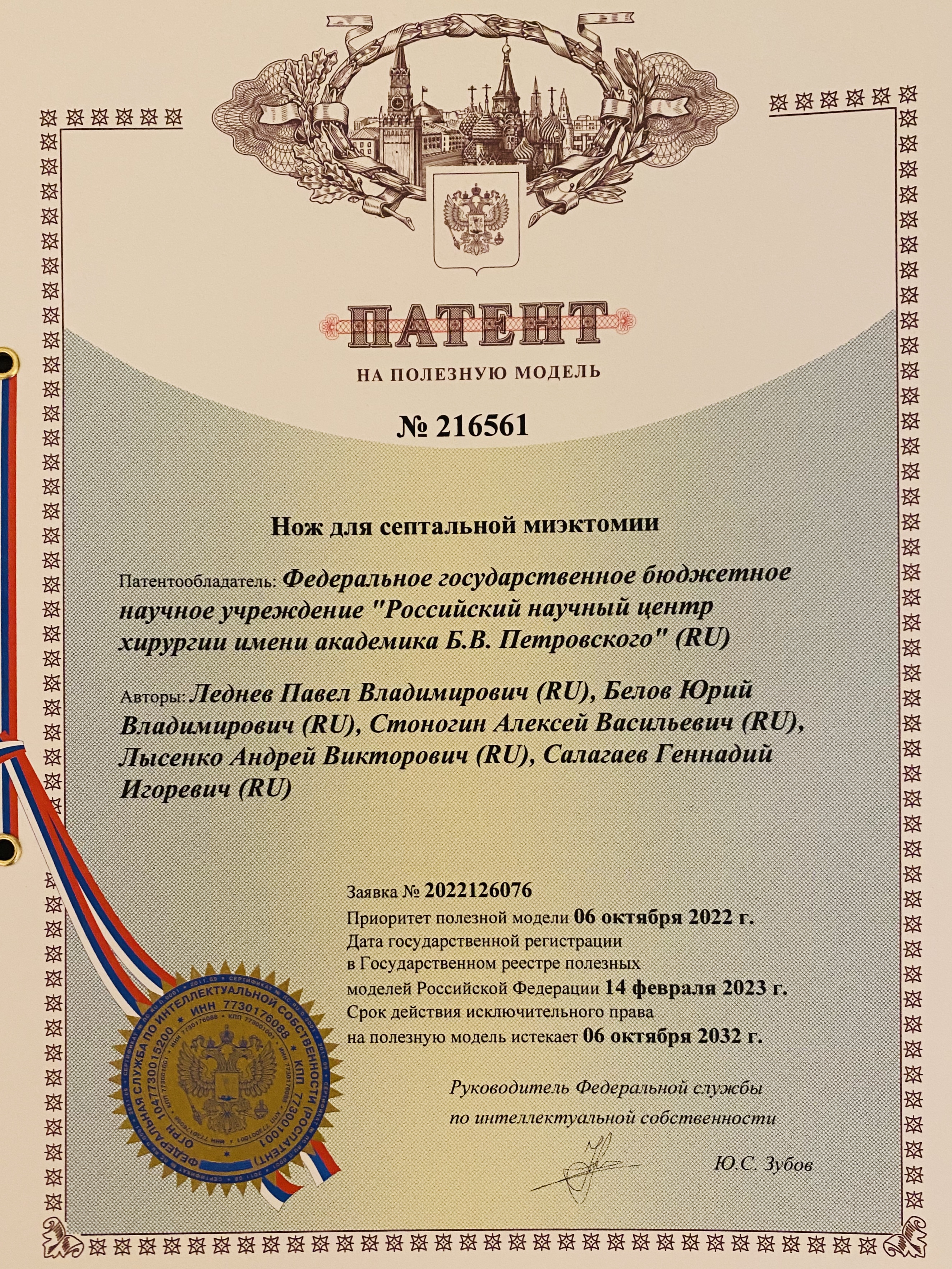 - «Нож для септальной миэктомии» № 216521, 2023 г.