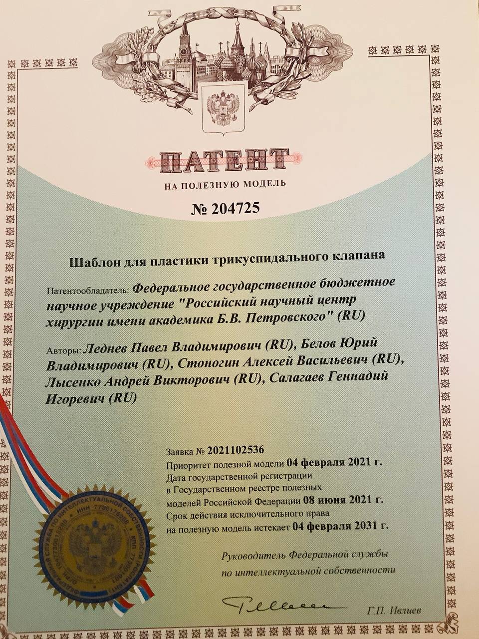 - «Шаблон для пластики трикуспидального клапана» № 204725, 2021 г.
