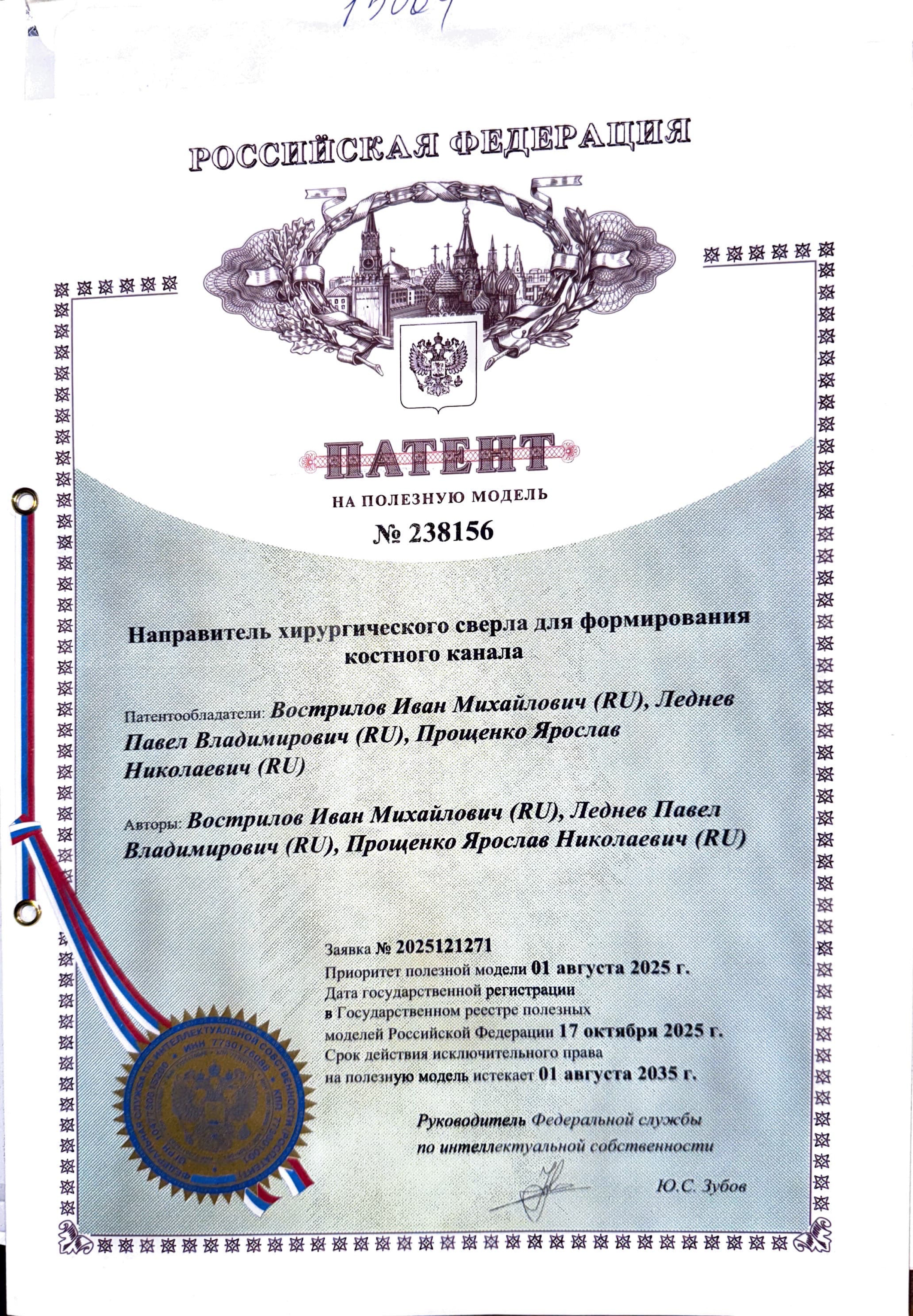- «Направитель хирургического сверла для формирования костного канала» № 238156, 2025 г.