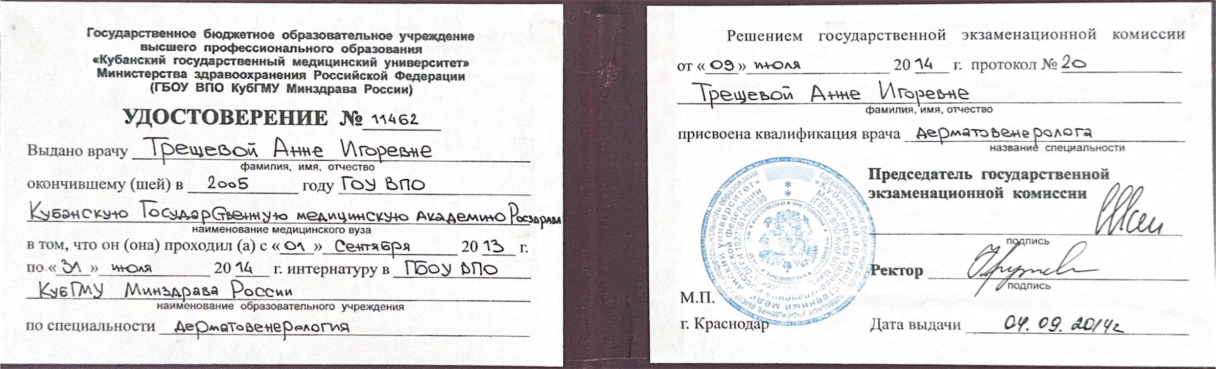 — Кубанский государственный медицинский университет (интернатура по специальности дерматовенерология)